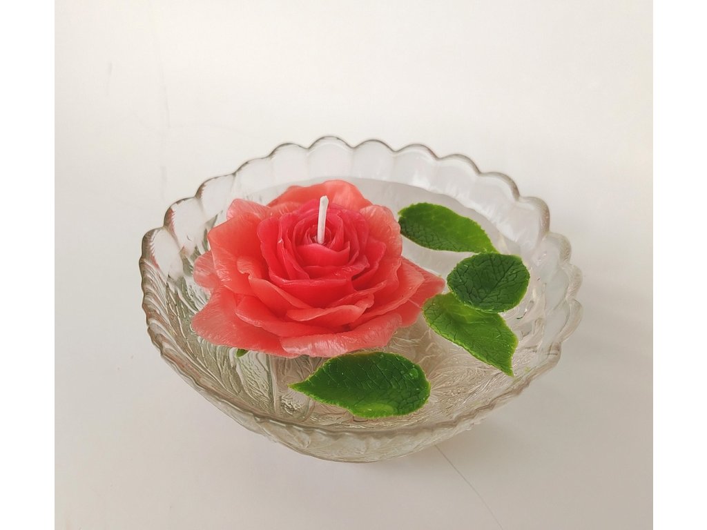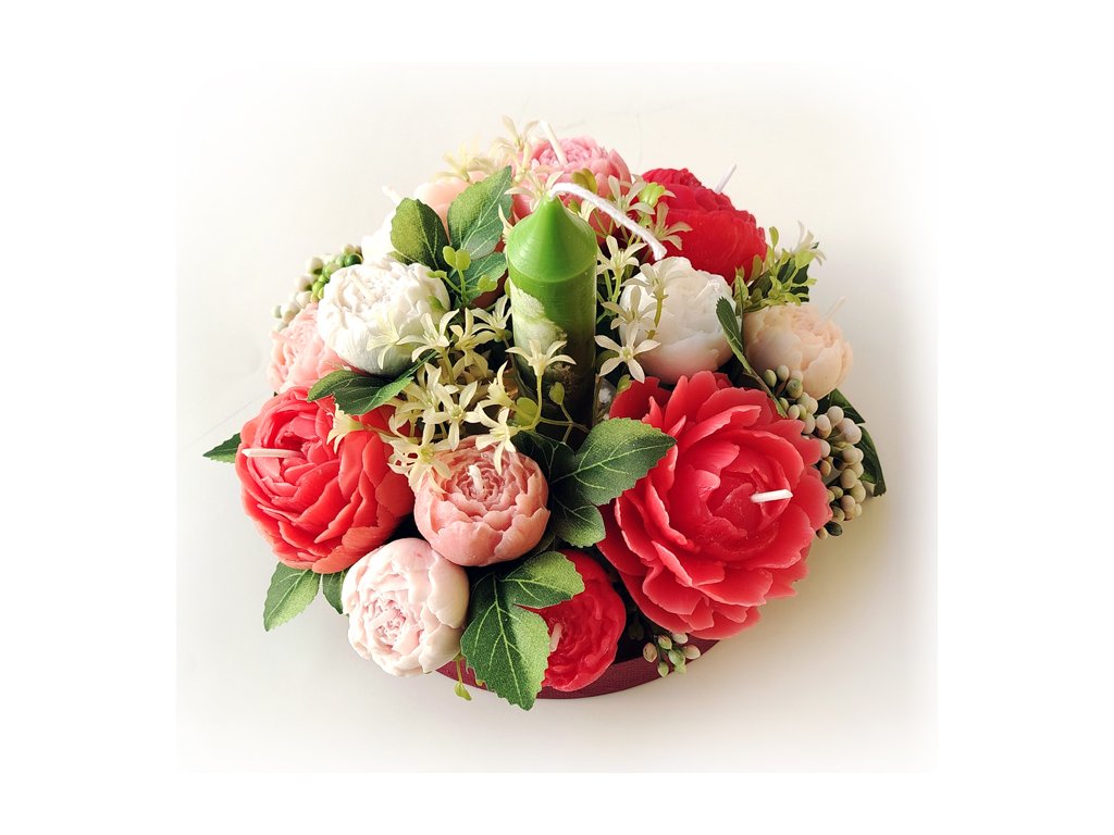Květinová kompozice z ručně vyrobených svíček ve tvaru pivoněk a růží