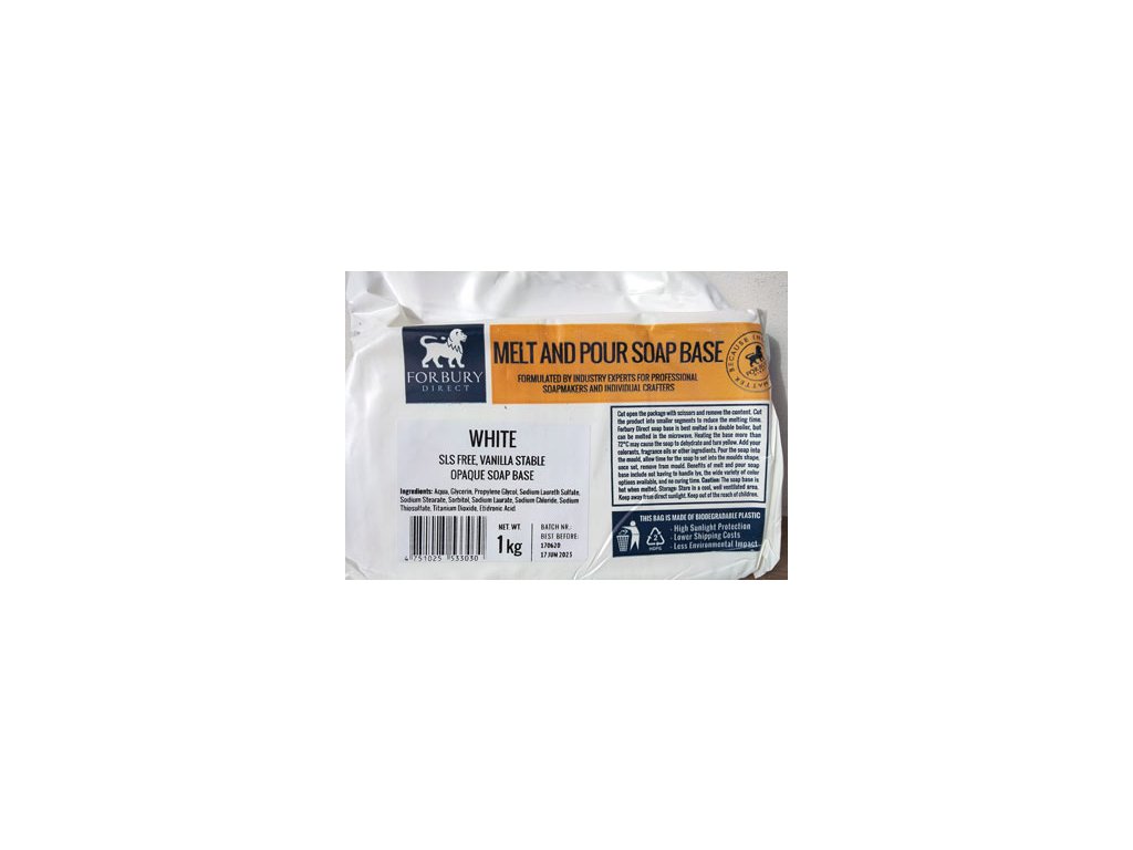 Základem mýdla je speciální glycerinová mýdlová hmota SLS free (viz obrázek 4.) špičkové kvality značky Forbury. Neobsahuje SLS , SLES. Při výrobě mýdla se používají potravinářská nebo speciální antialergická barviva a aroma (viz obr.5.).