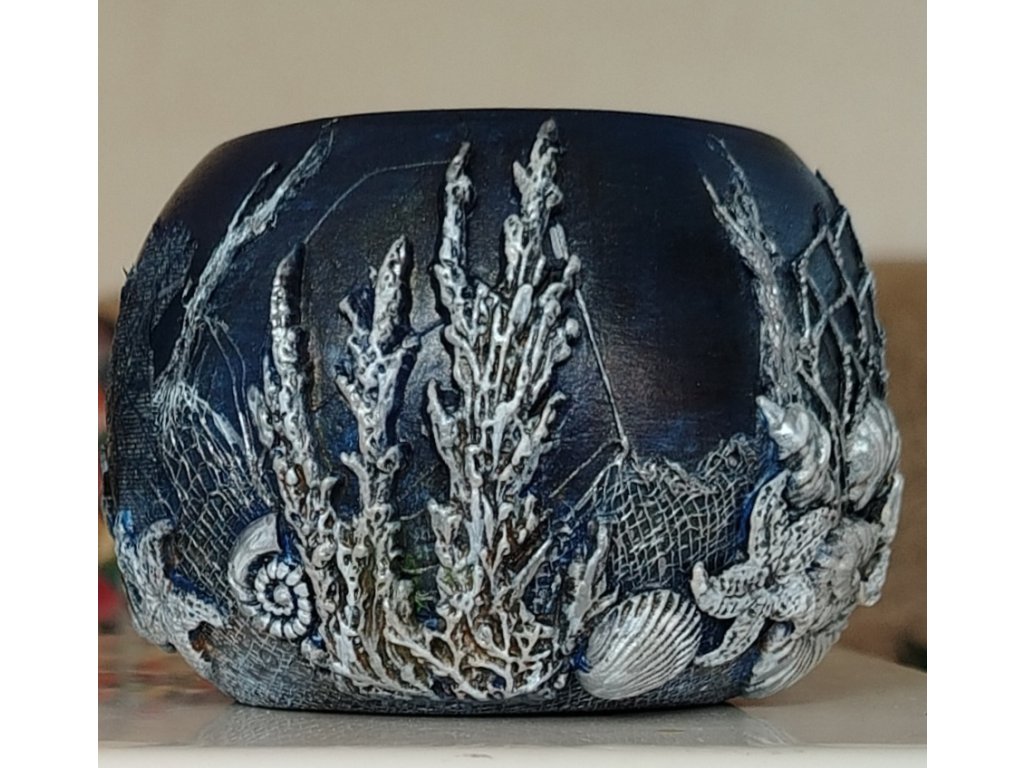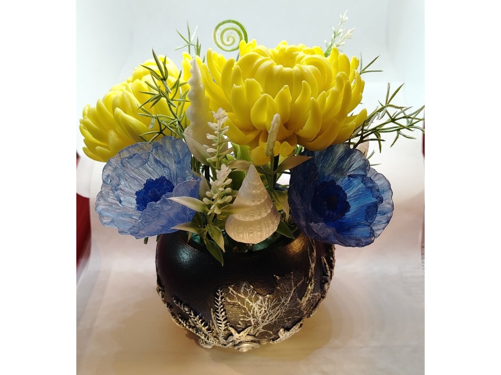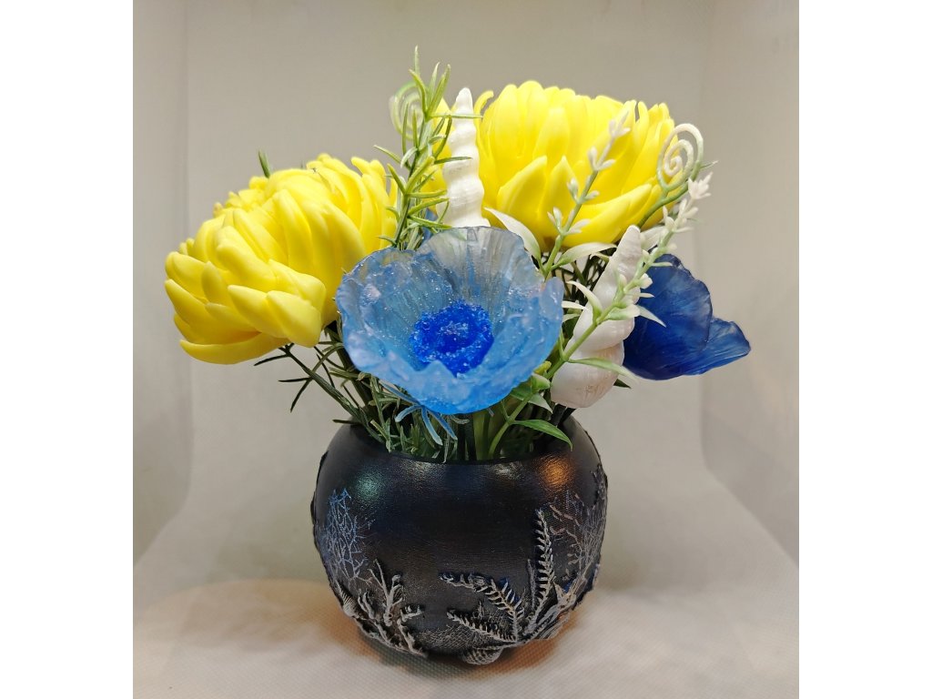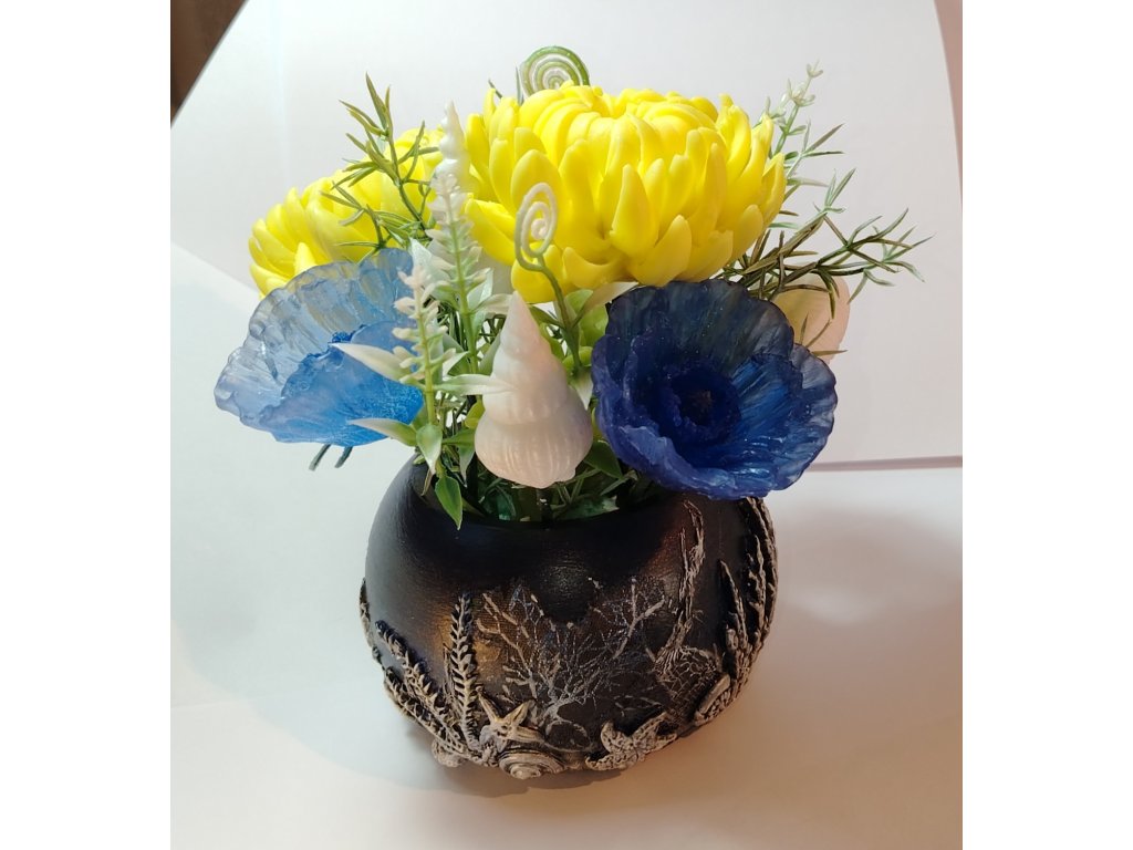 Kreativní kytice voňavých mýdlových růží a mušlí v keramickém květináči na téma Mořské Dno. .