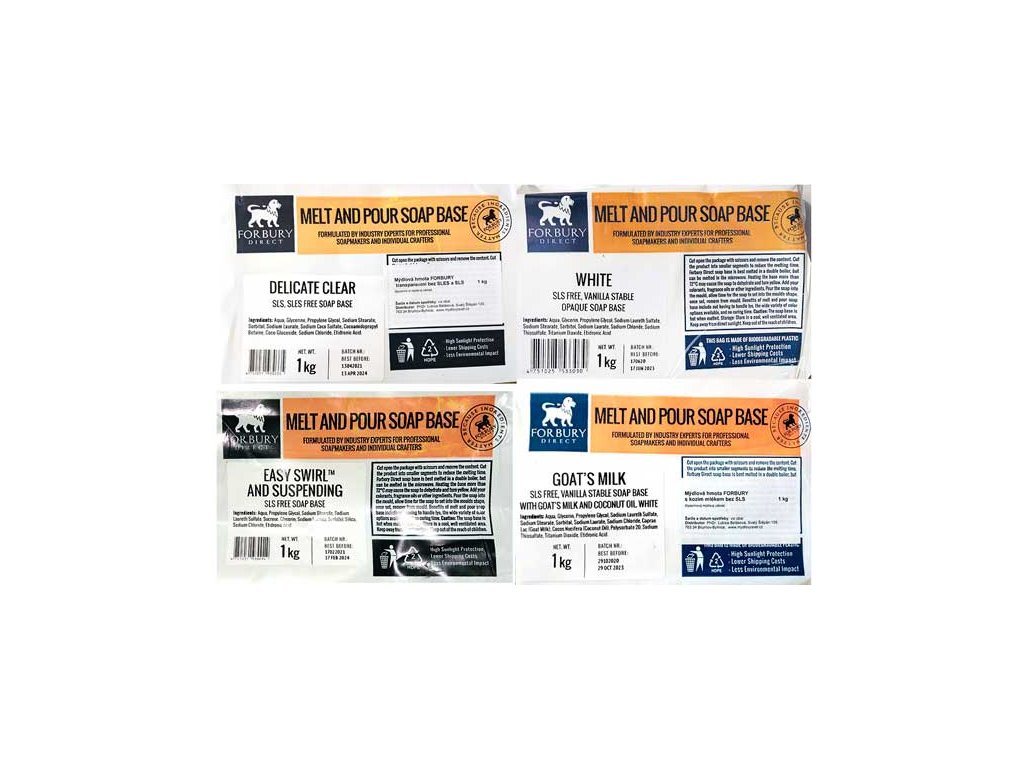 Základem je kvalitní mýdlová hmota na výrobu mýdla SLS free (viz obrázek 4.). Při výrobě mýdla se používají potravinářská nebo speciální antialergická barviva a aroma (viz obr.5.). Mýdla mají vynikající jemnou květinovou vůni.